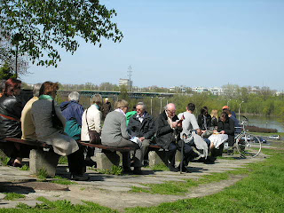 Warszaw on a sunny Sunday: people outside reading, talking, watching.